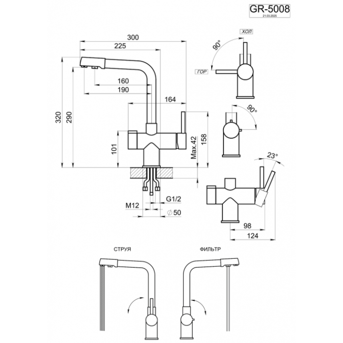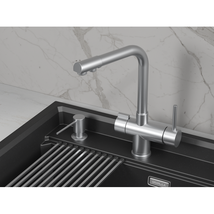 Смеситель для кухни GRANULA 5008, НЕРЖ Высокий Двухрычажный Нержавеющая сталь Нержавеющая сталь 445х325х70 РОССИЯ Корпус 5 лет, покрытие 2 года, картридж 1 год, резиновые прокладки 6 мес., гибкая подводка 6 мес. Гибкая подводка, комплект креплений, переходник для подключения фильтра с пиьевой водой