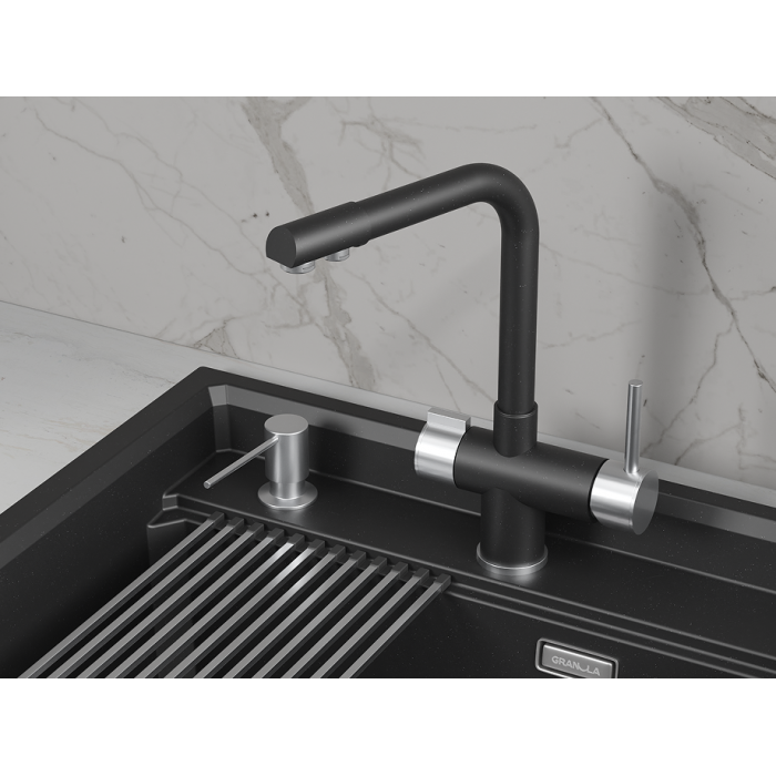 Смеситель для кухни GRANULA 5008, ШВАРЦ (чёрный металлик) Высокий Двухрычажный Нержавеющая сталь Нержавеющая сталь 445х325х70 РОССИЯ Корпус 5 лет, покрытие 2 года, картридж 1 год, резиновые прокладки 6 мес., гибкая подводка 6 мес. Гибкая подводка, комплект креплений, переходник для подключения фильтра с пиьевой водой