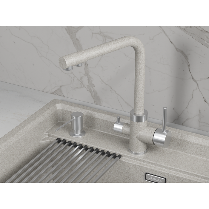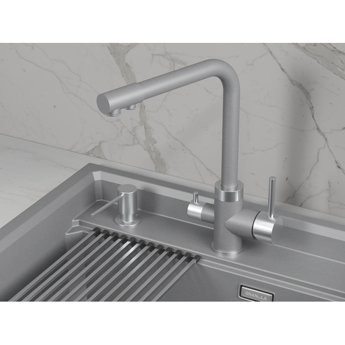 Смеситель для кухни GRANULA 5015, БАЗАЛЬТ Высокий Двухрычажный Нержавеющая сталь Нержавеющая сталь 445х325х70 РОССИЯ Корпус 5 лет, покрытие 2 года, картридж 1 год, резиновые прокладки 6 мес., гибкая подводка 6 мес. Гибкая подводка, комплект креплений, переходник для подключения фильтра с питьевой водой