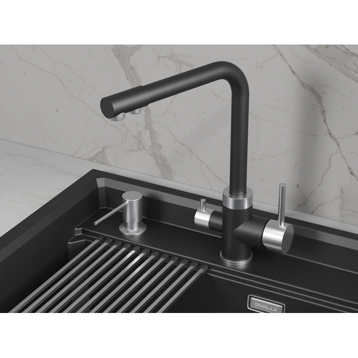 Смеситель для кухни GRANULA 5015, ШВАРЦ (чёрный металлик) Высокий Двухрычажный Нержавеющая сталь Нержавеющая сталь 445х325х70 РОССИЯ Корпус 5 лет, покрытие 2 года, картридж 1 год, резиновые прокладки 6 мес., гибкая подводка 6 мес. Гибкая подводка, комплект креплений, переходник для подключения фильтра с питьевой водой