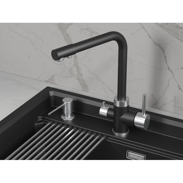 Смеситель для кухни GRANULA 5015, ТУРМАЛИН Высокий Двухрычажный Нержавеющая сталь Нержавеющая сталь 445х325х70 РОССИЯ Корпус 5 лет, покрытие 2 года, картридж 1 год, резиновые прокладки 6 мес., гибкая подводка 6 мес. Гибкая подводка, комплект креплений, переходник для подключения фильтра с питьевой водой