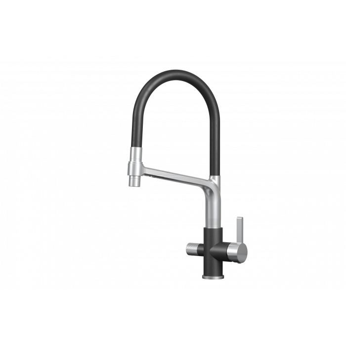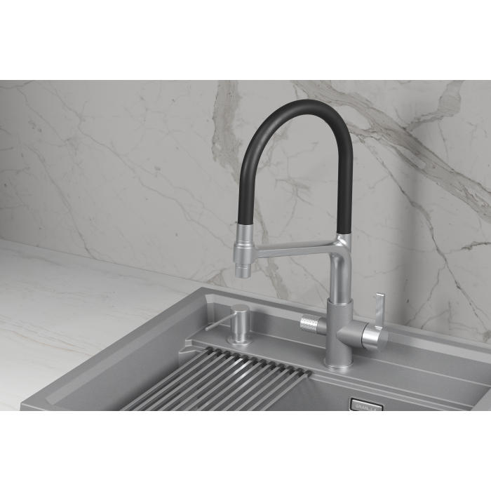 Смеситель для кухни GRANULA 5083, АЛЮМИНИУМ Гибкий Двухрычажный Нержавеющая сталь РОССИЯ Корпус 5 лет, покрытие 2 года, картридж 1 год, резиновые прокладки 6 мес., гибкая подводка 6 мес. Гибкая подводка (600 мм), комплект креплений, переходник для подключения фильтра с питьевой водой