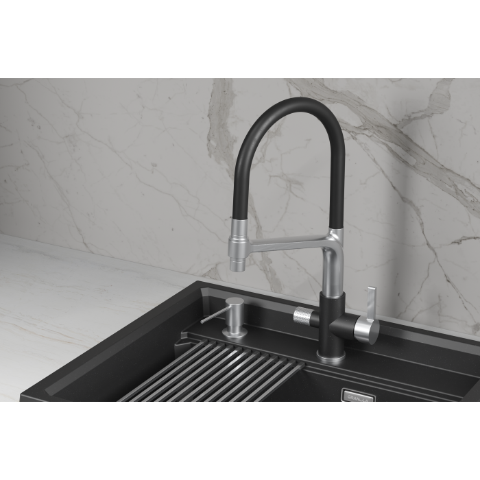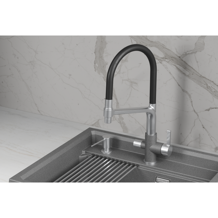 Смеситель для кухни GRANULA 5083, ГРАФИТ (ЧЁРНО-СЕРЫЙ) Гибкий Двухрычажный Нержавеющая сталь РОССИЯ Корпус 5 лет, покрытие 2 года, картридж 1 год, резиновые прокладки 6 мес., гибкая подводка 6 мес. Гибкая подводка (600 мм), комплект креплений, переходник для подключения фильтра с питьевой водой