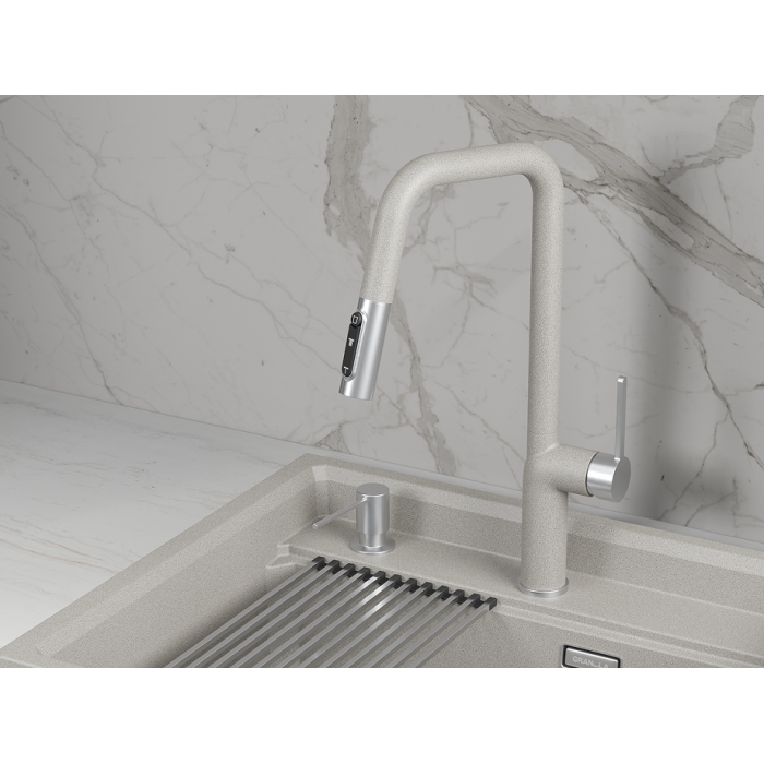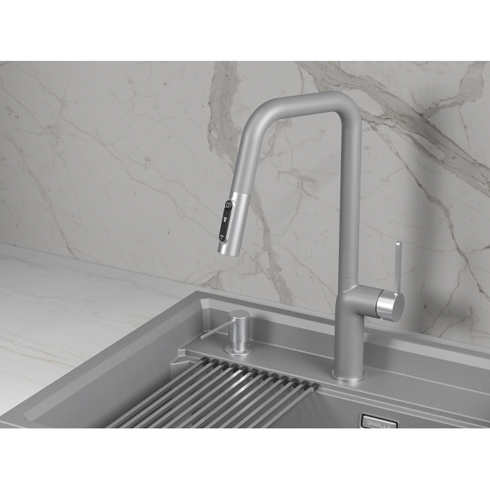 Смеситель для кухни GRANULA 9011, БАЗАЛЬТ Выдвижной Однорычажный Нержавеющая сталь Нержавеющая сталь 655х285х75 РОССИЯ Корпус 5 лет, покрытие 2 года, картридж 1 год, резиновые прокладки 6 мес., гибкая подводка 6 мес. Гибкая подводка, комплект креплений, противовес, пластиковый упор, инструкция к использованию