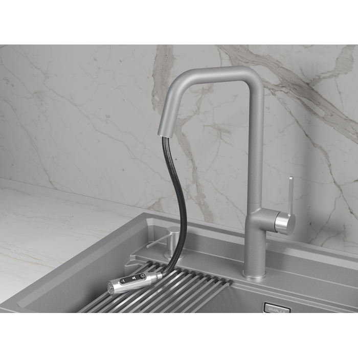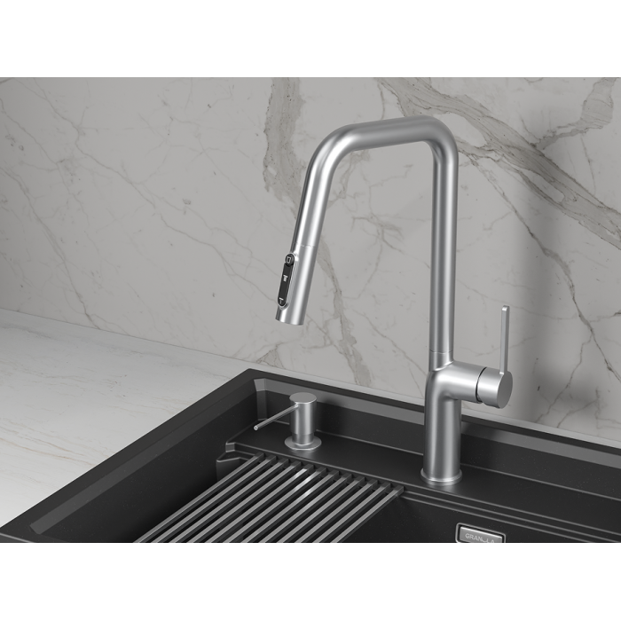 Смеситель для кухни GRANULA 9011, НЕРЖ Выдвижной Однорычажный Нержавеющая сталь Нержавеющая сталь 655х285х75 РОССИЯ Корпус 5 лет, покрытие 2 года, картридж 1 год, резиновые прокладки 6 мес., гибкая подводка 6 мес. Гибкая подводка, комплект креплений, противовес, пластиковый упор, инструкция к использованию