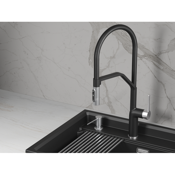 Смеситель для кухни GRANULA 9012, ТУРМАЛИН Гибкий Однорычажный Нержавеющая сталь РОССИЯ Корпус 5 лет, покрытие 2 года, картридж 1 год, резиновые прокладки 6 мес., гибкая подводка 6 мес. Гибкая подводка, комплект креплений, переходник для подключения фильтра с пиьевой водой