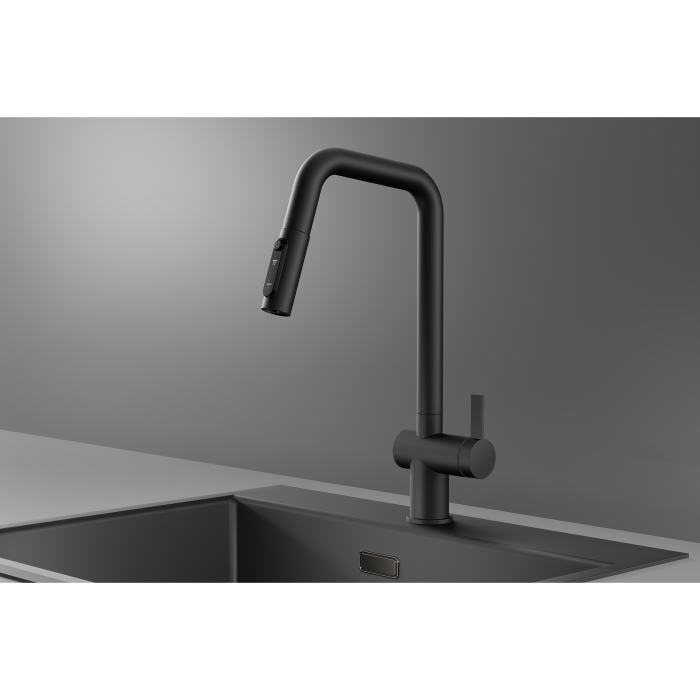 Смеситель для кухни GRANULA KS-7273, ЧЕРНЫЙ МАТОВЫЙ, с выдвижным изливом с переключением на душ и фильтром,сталь