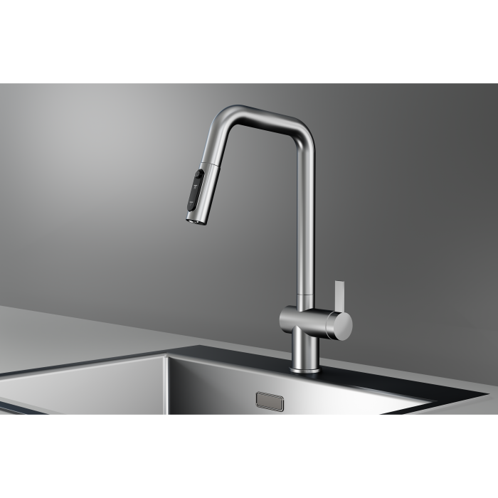 Смеситель для кухни GRANULA KS-7273, СТАЛЬ САТИН, с выдвижным изливом с переключением на душ и фильтром,сталь