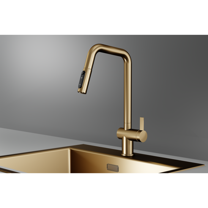 Смеситель для кухни GRANULA KS-7273, ЗОЛОТО САТИН, с выдвижным изливом с переключением на душ и фильтром,сталь