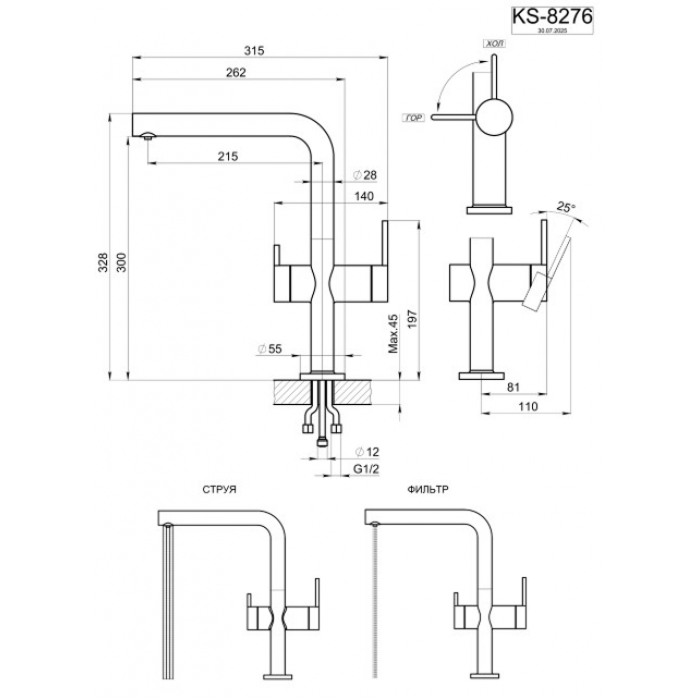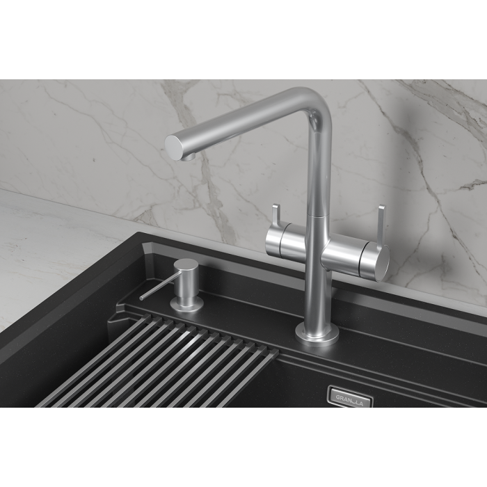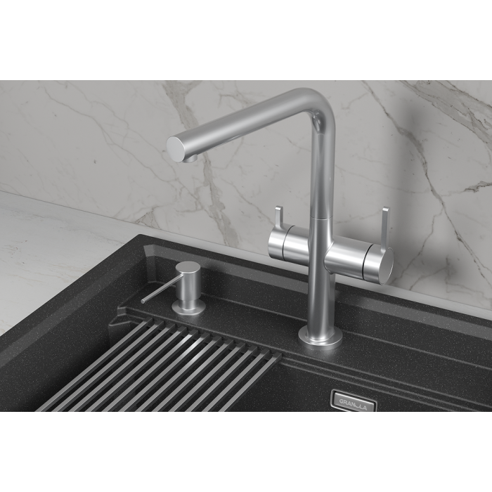 Смеситель для кухни GRANULA KS-8276, НЕРЖ, KITCHEN SPACE Высокий Двухрычажный Нержавеющая сталь 655х302х87 РОССИЯ Корпус 10 лет, покрытие 2 года, картридж 1 год, резиновые прокладки 6 мес., гибкая подводка 6 мес., кранбукса 6 мес. Гибкая подводка, комплект креплений, переходник для подключения фильтра с питьевой водой