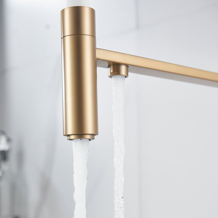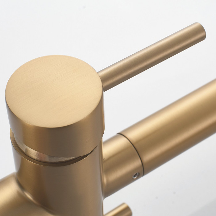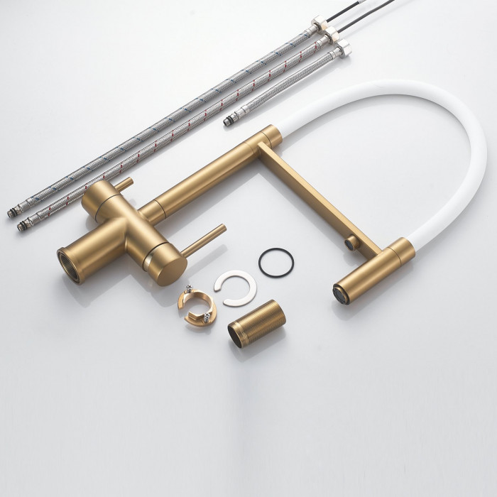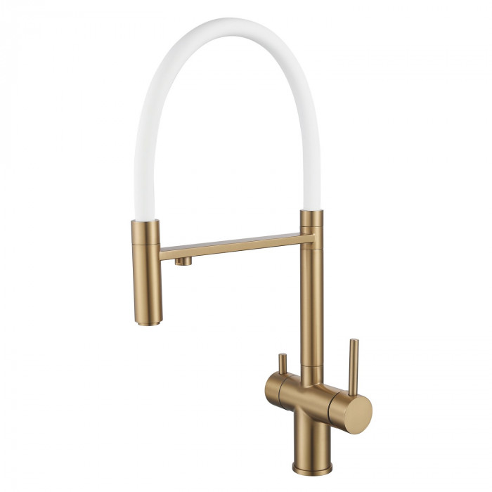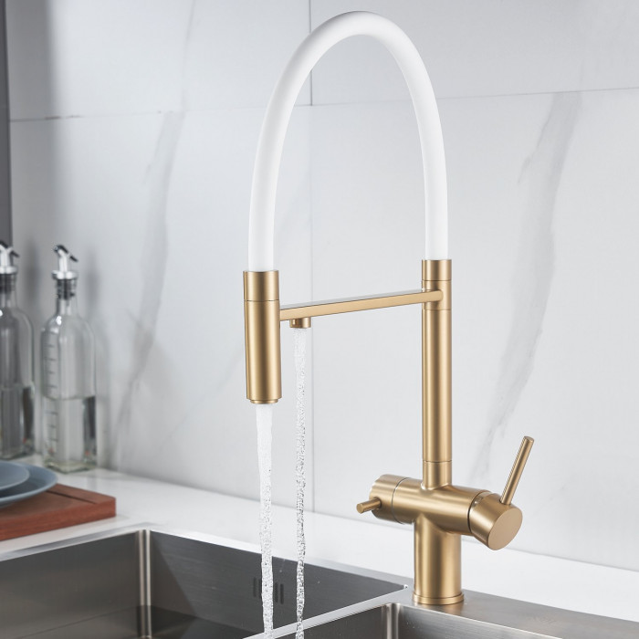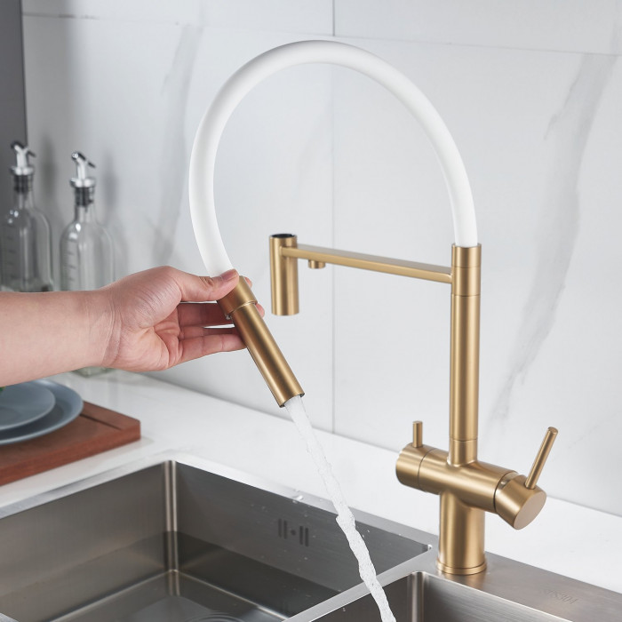 Смеситель для кухни с гибким изливом и подключением фильтра Shevanik S178G, золотой сатин/белый