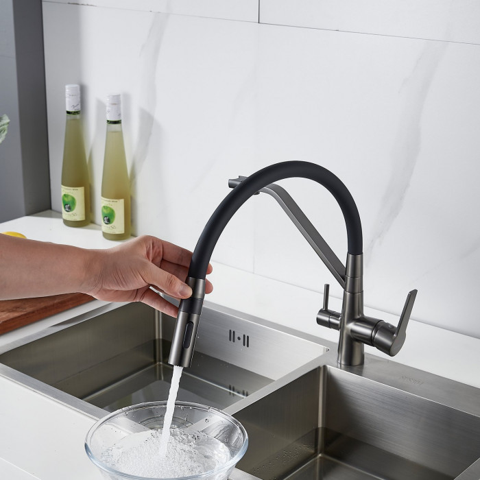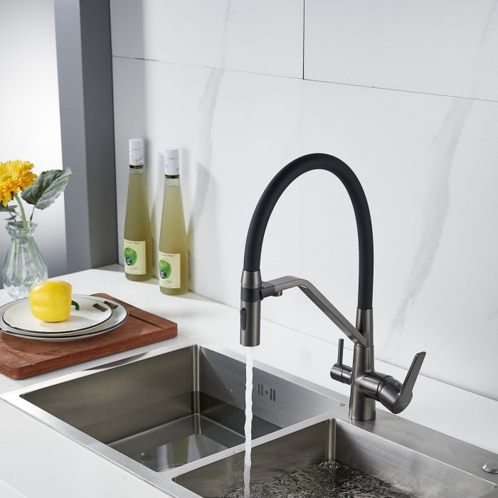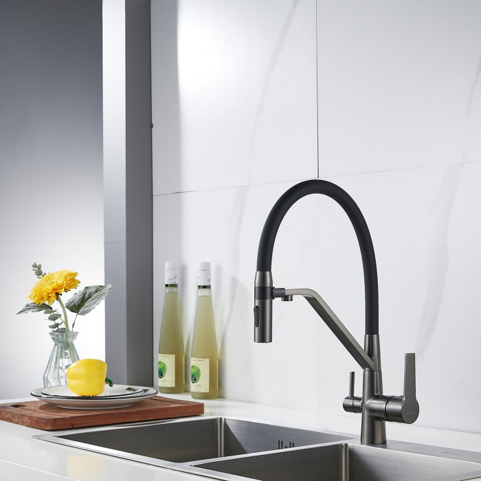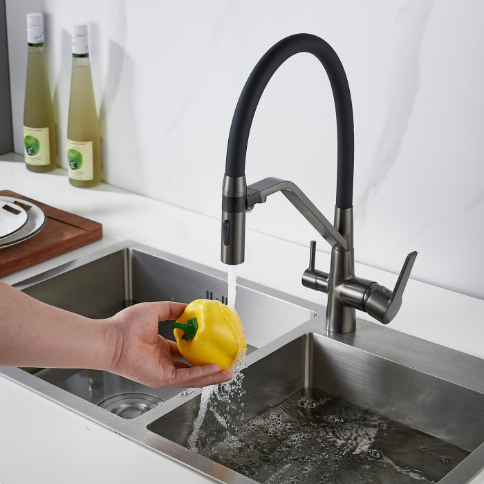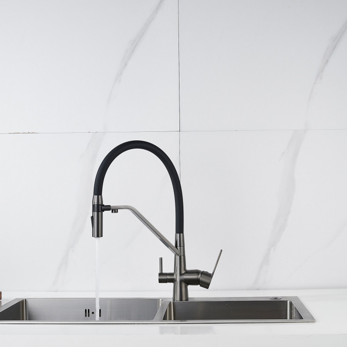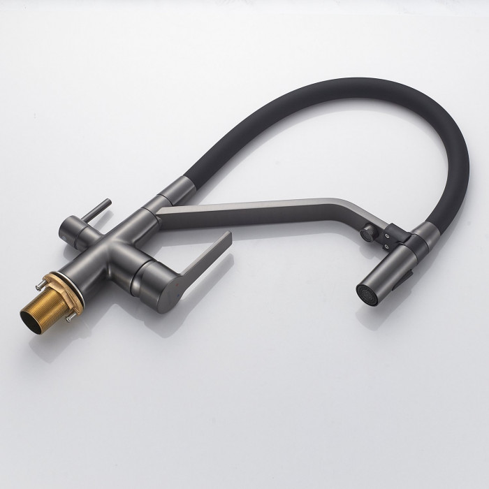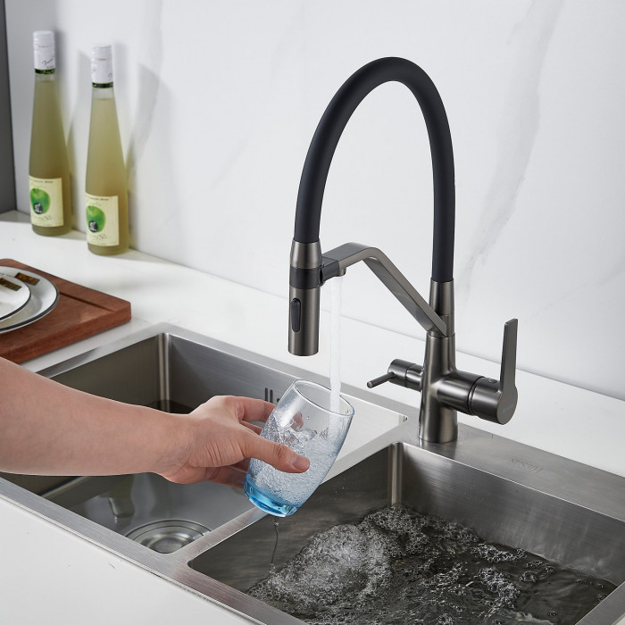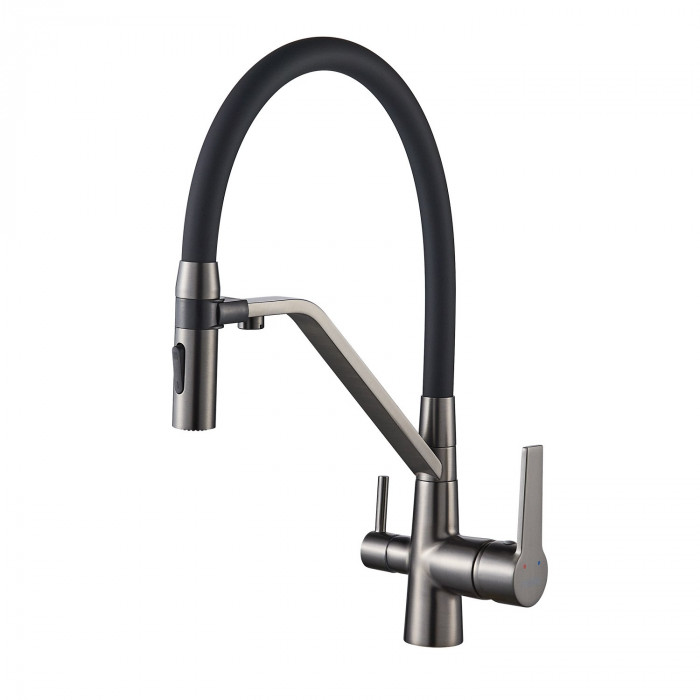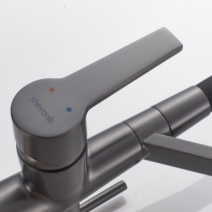 Смеситель для кухни с гибким изливом и подключением фильтра Shevanik S278T, оружейная сталь