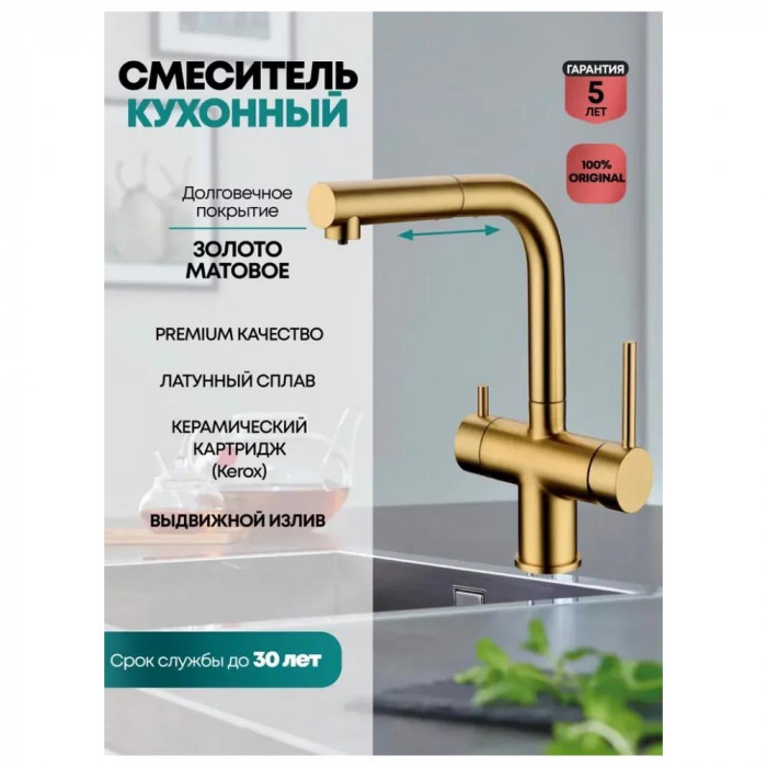 Смеситель для кухни с выдвижным изливом Grocenberg GB4097MG, матовое золото Смеситель для кухни под фильтр с выдвижным изливом Grocenberg GB4097 Матовое золото