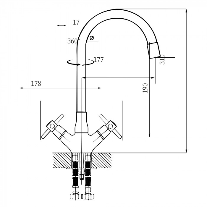 Смеситель для кухни TOKITO ENA хром (TOK-ENA-1013) Двухвентильный смеситель Tokito для кухни — это гармония японского качества и продуманной функциональности. Классический дизайн с двумя ручками обеспечивает точный контроль температуры и напора воды, а гибкий излив значительно упрощает мытье продуктов и уход за мойкой. Япония смеситель для кухни латунь