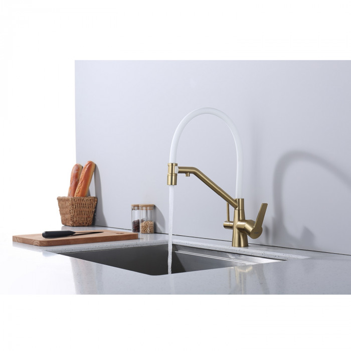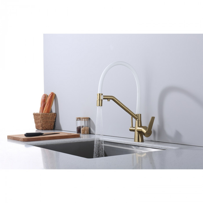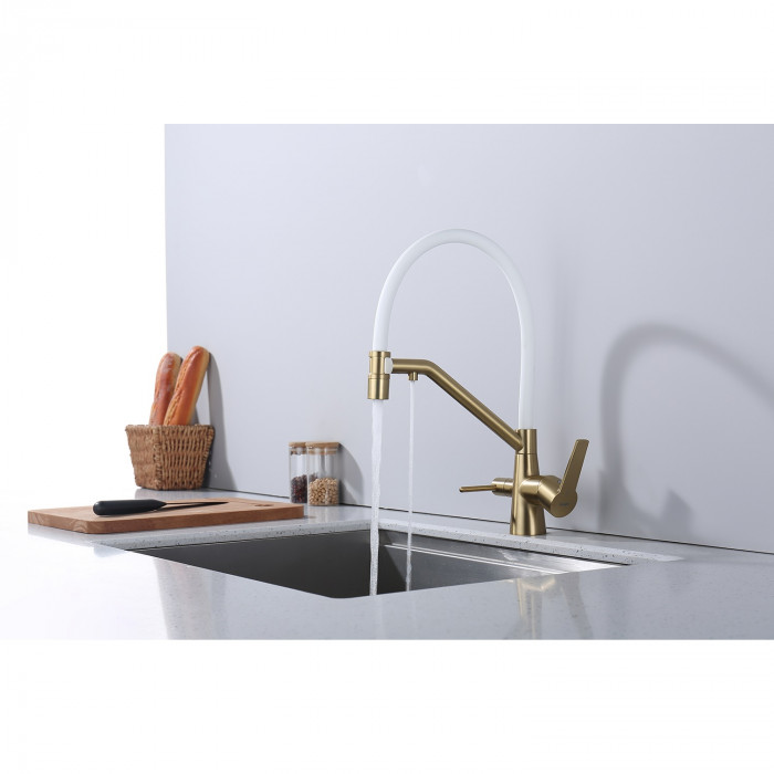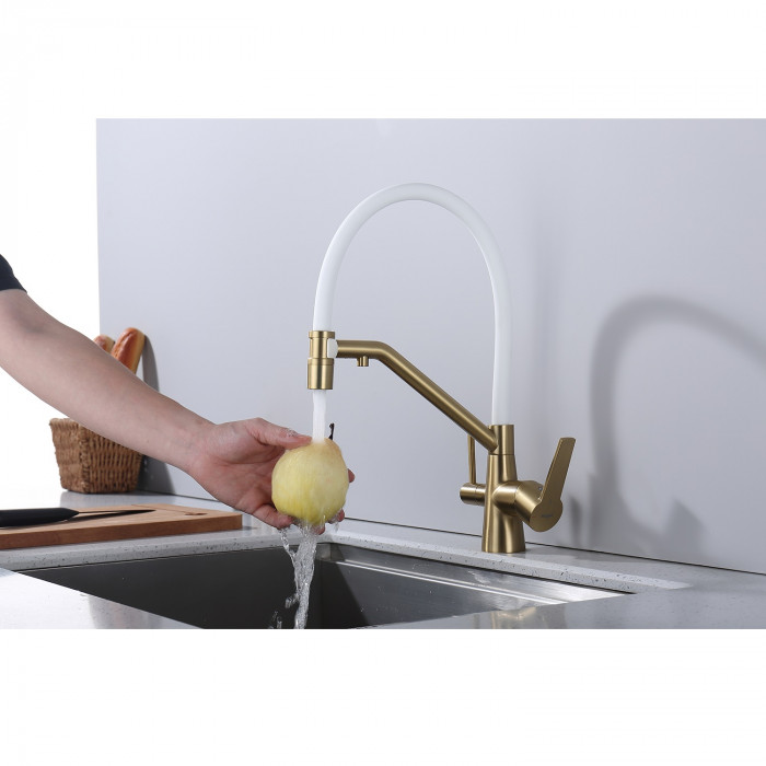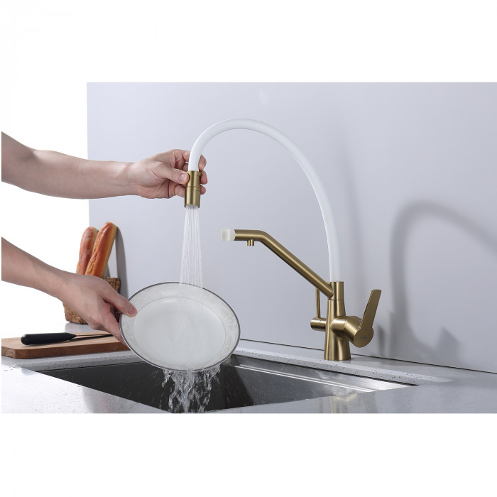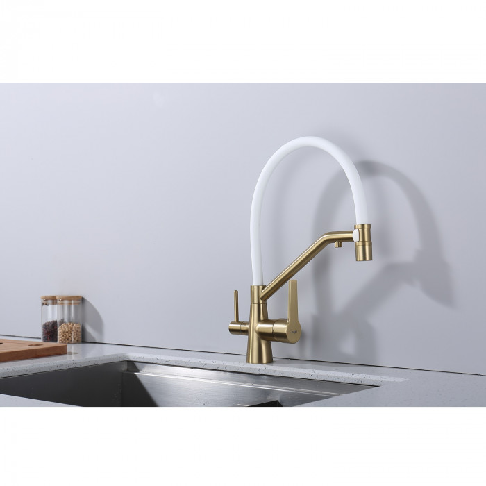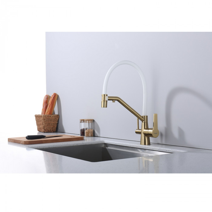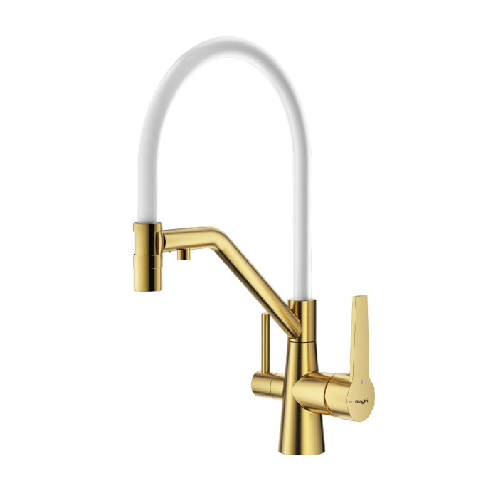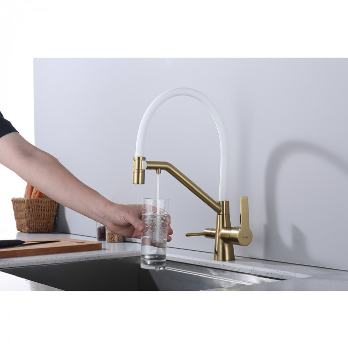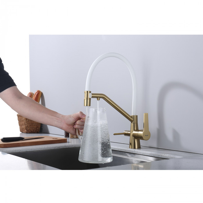 Смеситель Raglo для кухни со съемным гибким изливом, с магнитным фиксатором излива, с подключением фильтра питьевой воды R80.62.03 золотой сатин