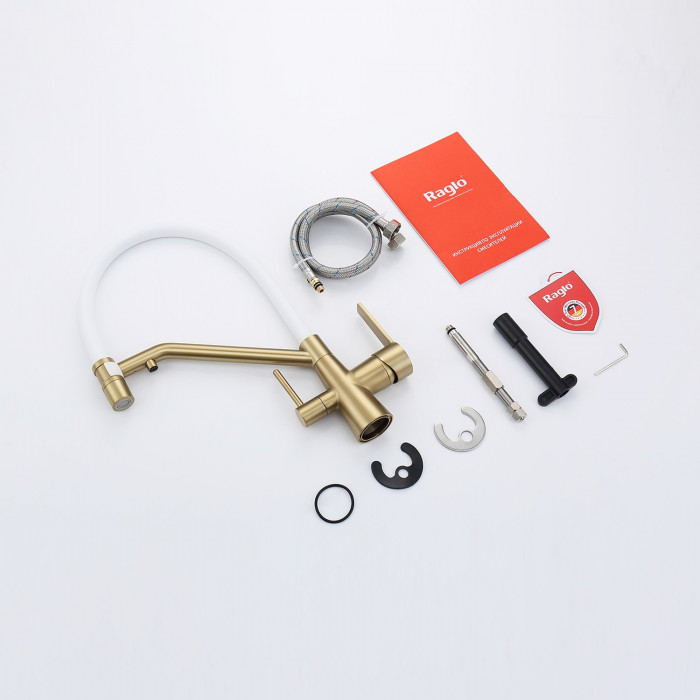 Смеситель Raglo для кухни со съемным гибким изливом, с магнитным фиксатором излива, с подключением фильтра питьевой воды R80.62.03 золотой сатин Основные характеристики: