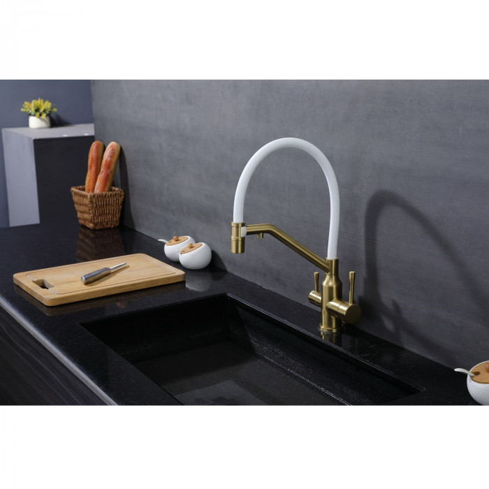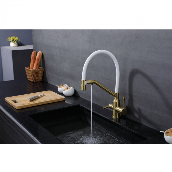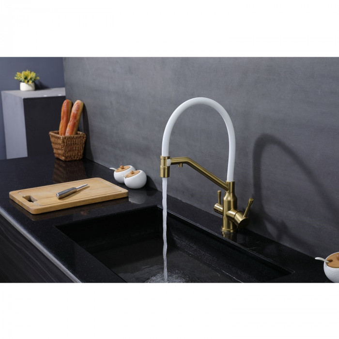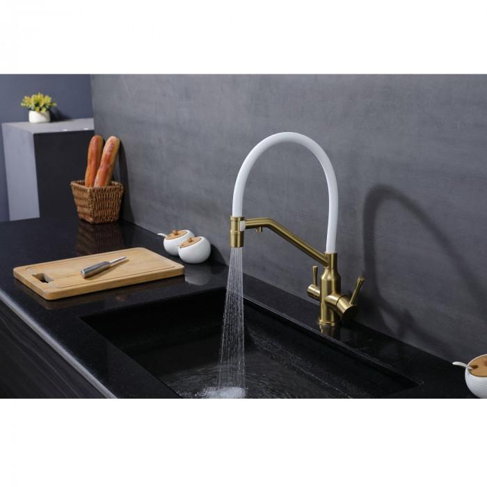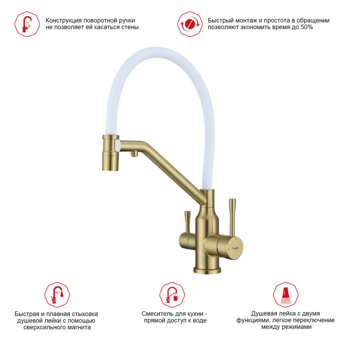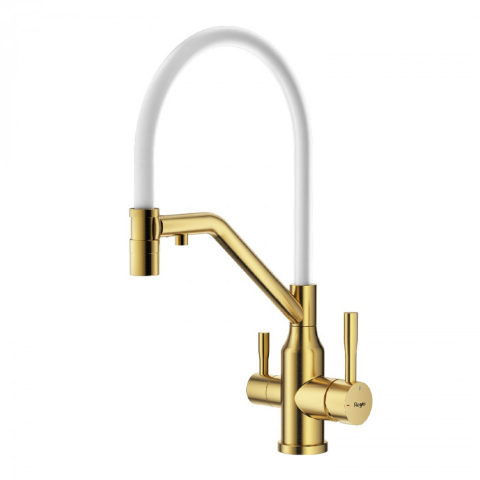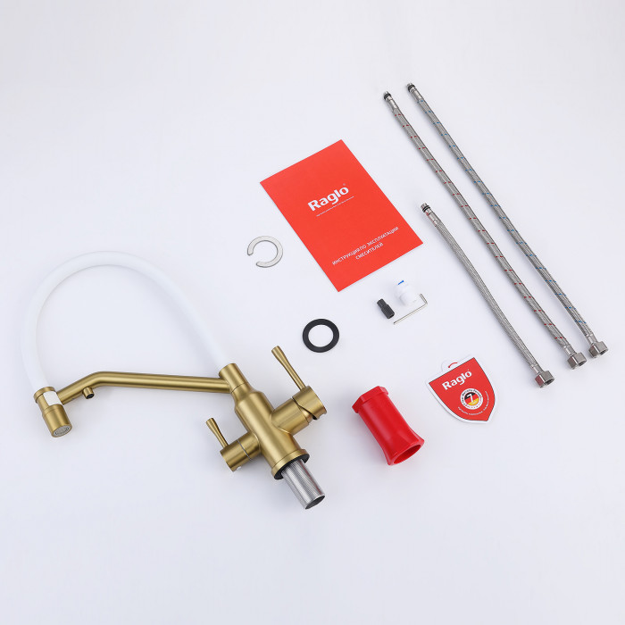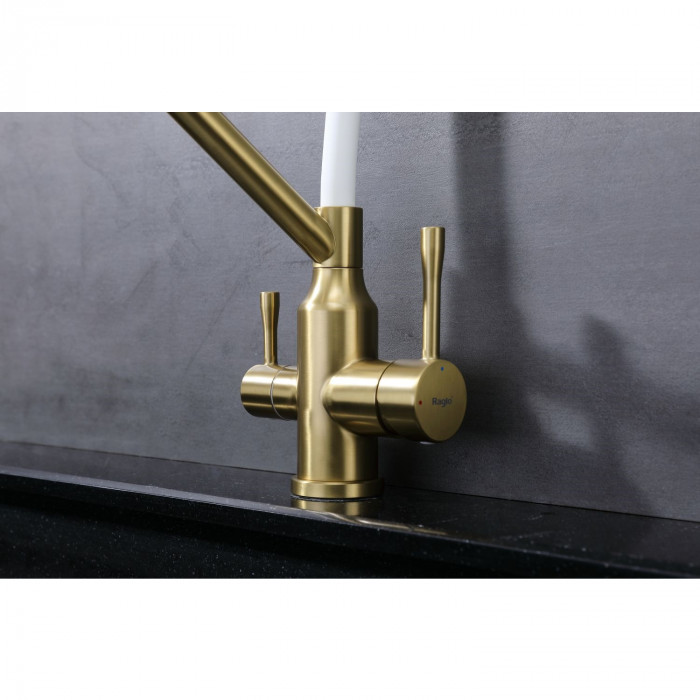 Смеситель Raglo для кухни со съемным гибким изливом, с магнитным фиксатором излива, с подключением фильтра питьевой воды R81.62.03 золотой сатин