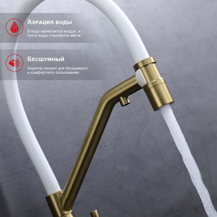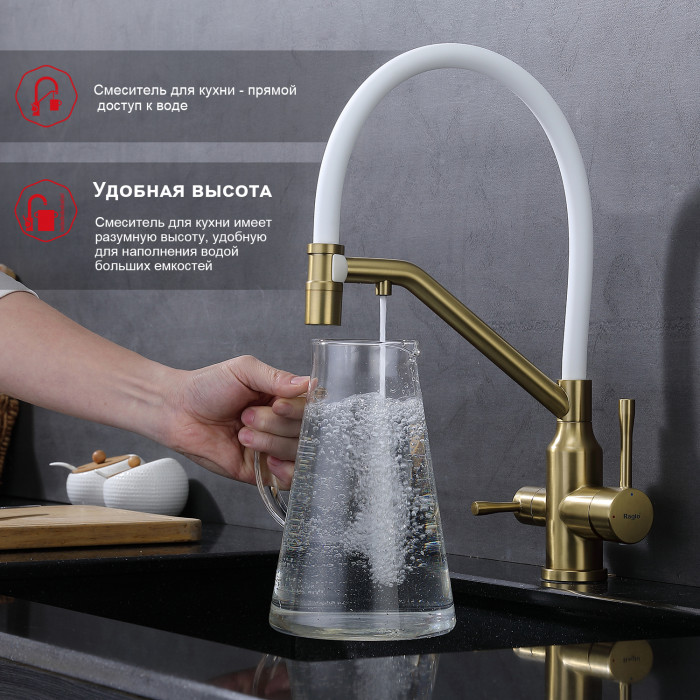 Смеситель Raglo для кухни со съемным гибким изливом, с магнитным фиксатором излива, с подключением фильтра питьевой воды R81.62.03 золотой сатин Основные характеристики: