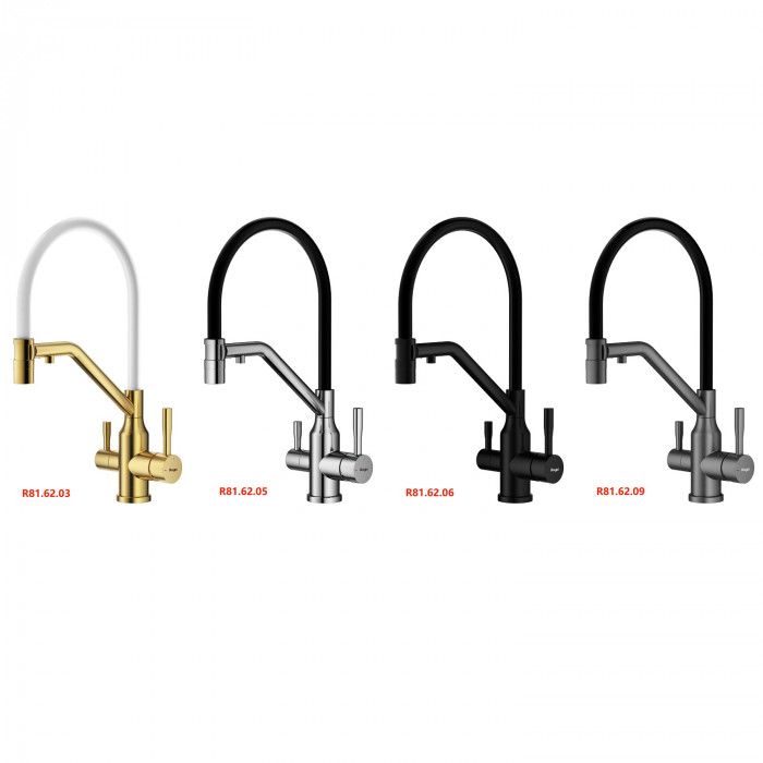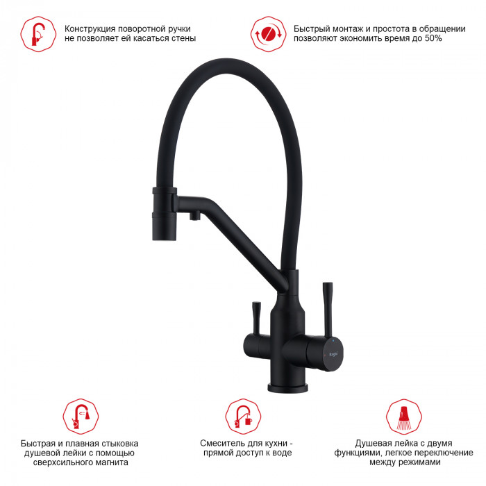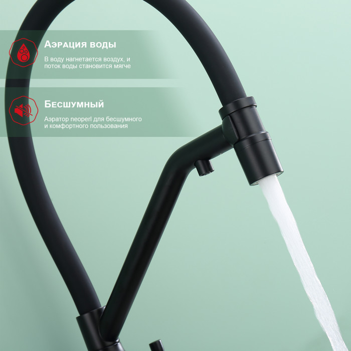 Смеситель Raglo для кухни со съемным гибким изливом, с магнитным фиксатором излива, с подключением фильтра питьевой воды R81.62.06 черный Основные характеристики: