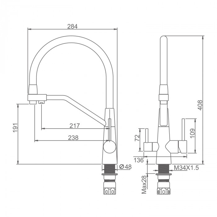 • Излив: гибкий, поворотный,Совмещенный излив для питьевой воды