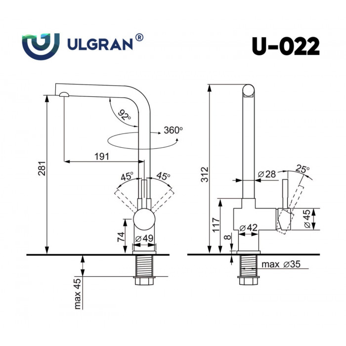 Смеситель Ulgran Classic бежевый Ulgran 022328 Китай нержавеющая сталь бежевый современный на кухонную мойку 3 года Размер основной чаши, мм 1. Смеситель в фирменной коробке.2.Гибкая подводка 450 мм.3. Керамический картридж Wanhai4. Крепление