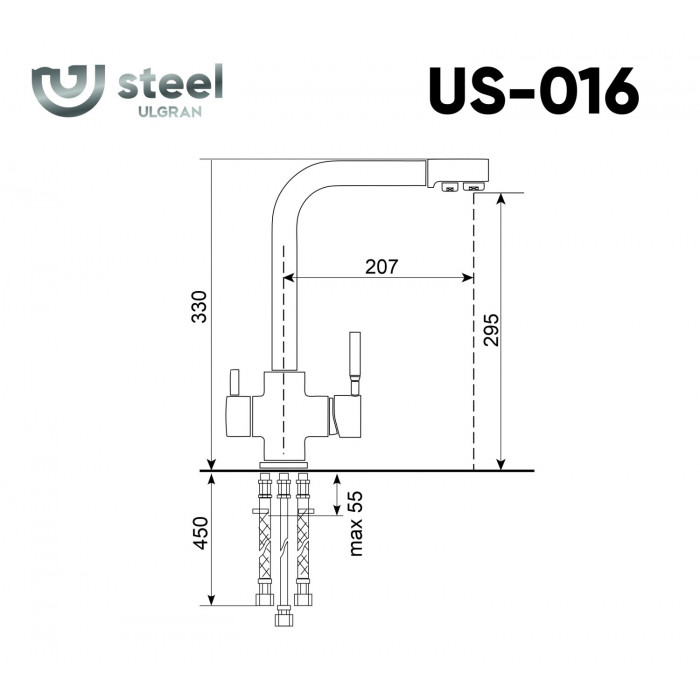 Смеситель ULGRAN Steel 016-002, цвет "черная брашированная сталь" US-016-002 Китай нержавеющая сталь черный современный на кухонную мойку 3 года Размер основной чаши, мм 1. Смеситель в фирменной коробке.2.Гибкая подводка 450 мм3. Керамический картридж Wanhai4. Крепление5. Дополнительный излив для фильтрованной воды (кран-букса с керамическими пластинами).6. Набор для подсоединения фильтра питьевой воды (гибкая подводка + переходник-цанга)