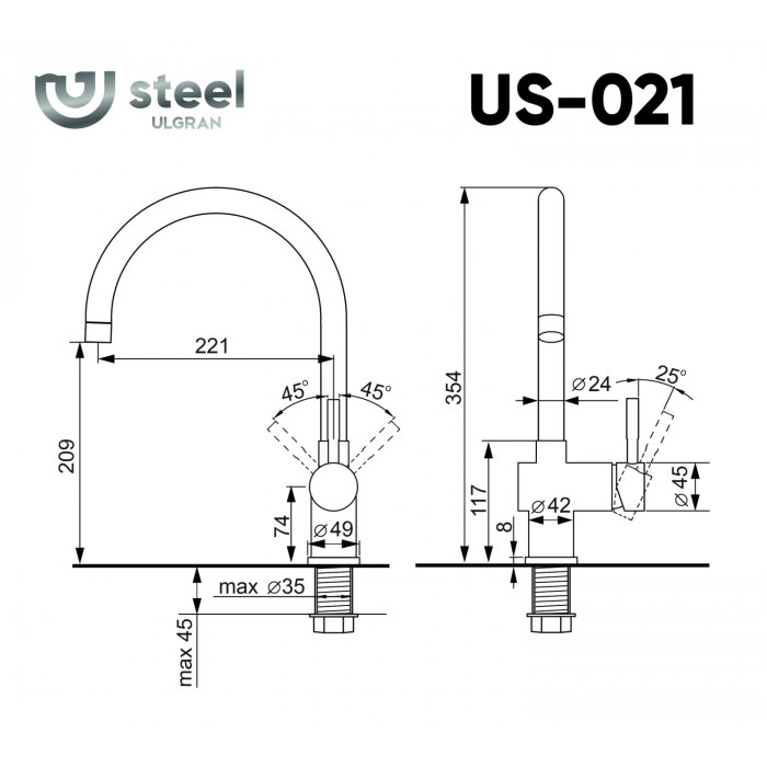 Смеситель ULGRAN Steel 021-003, цвет "вороненая сталь" US-021-003 Китай нержавеющая сталь графит современный на кухонную мойку 3 года Размер основной чаши, мм 1. Смеситель в фирменной коробке.2.Гибкая подводка 450 мм.3. Керамический картридж Wanhai4. Крепление