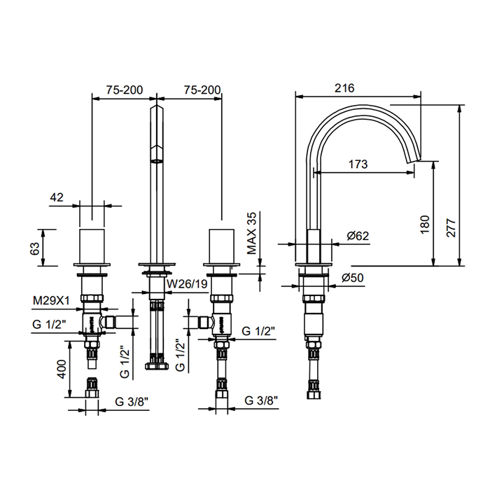 Смеситель для раковины Fantini Milano 29 01 N404SW Золото Fantini Venezia Смеситель для раковины, 3 отв., без донного клапана, излив 175мм, цвет: золото плюс