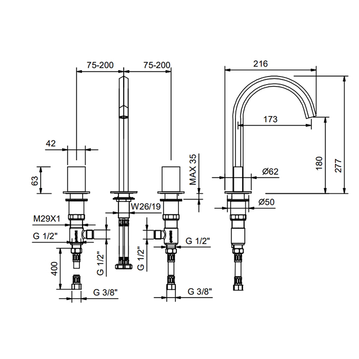 Смеситель для раковины Fantini Venezia 29 02 N404SW Хром Fantini Venezia Смеситель для раковины, 3 отв., без донного клапана, излив 175мм, цвет: хром