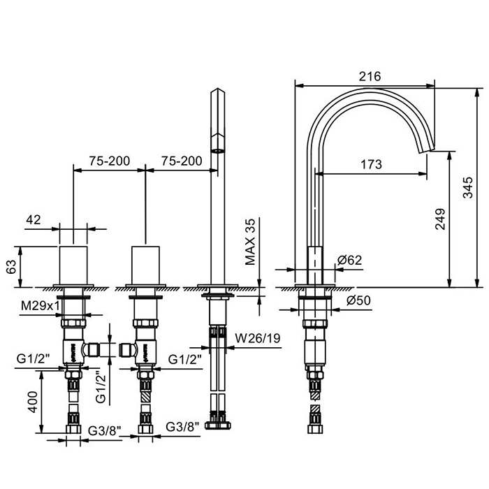 Смеситель для раковины Fantini Venezia 29 02 N405SW Хром Fantini Venezia Смеситель для раковины, 3 отв., без донного клапана, излив 175мм, цвет: хром