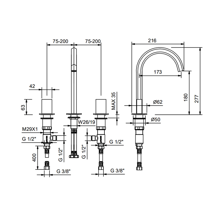 Смеситель для раковины Fantini Venezia 29 P5 N404SW Gun metal FANTINI VENEZIA Смеситель для раковины на 3 отверстия, излив 175 мм., без ручек, без донного клапана, цвет Matt Gun Metal PVD