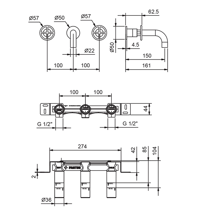 Смеситель для раковины Fantini Fontane Bianche 47 P5 P010B Gun metal Fantini Fontane Bianche Смеситель для раковины, встраиваемый, на 3 отв., без донного клапана, излив 150мм, (наружняя часть), цвет: Matt Gun Metal PVD