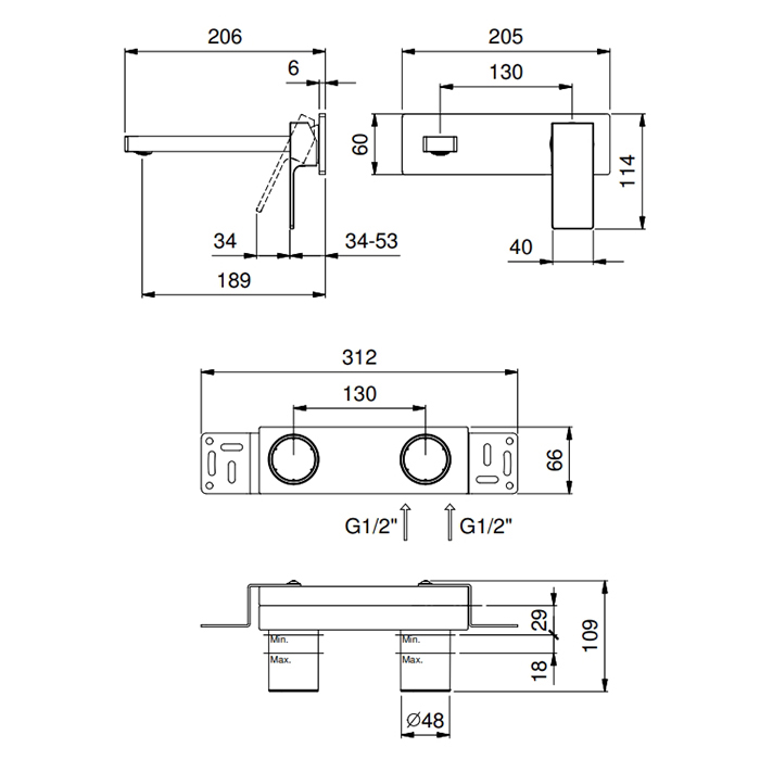 Смеситель для раковины Fantini Mint 34 13 F813B Черный матовый FANTINI MINT Смеситель для раковины, встраиваемый, на 2 отв, без донного клапана, излив 190мм (наружняя часть), цвет: черный матовый