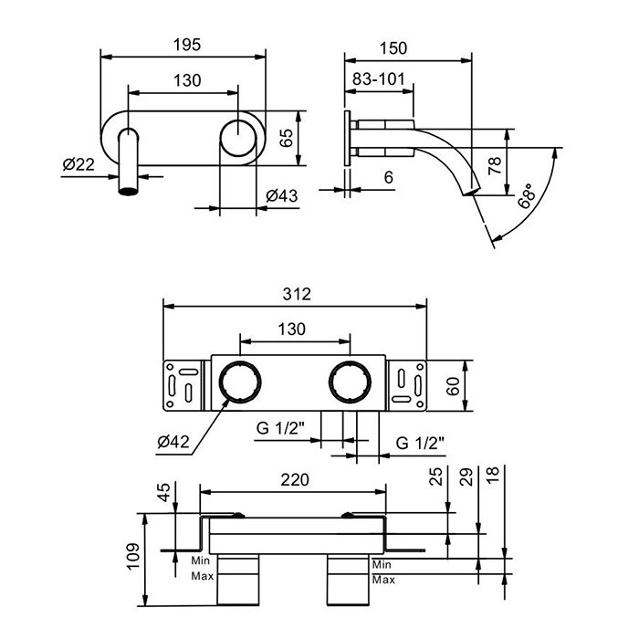 Смеситель для раковины Fantini Nice 65 02 S010SB Хром Fantini Nice Смеситель для раковины, встраиваемый, на 2 отв, без донного клапана, излив 150мм (наружняя часть), цвет: хром