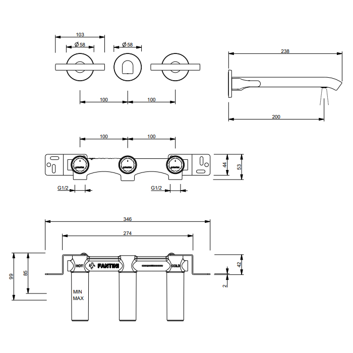 Смеситель для раковины Fantini Sailing 67 P5 J013B Gun metal FANTINI SAILING Смеситель для раковины настенный встраиваемый, двухвентильный, внешняя часть, цвет Matt Gun Metal PVD