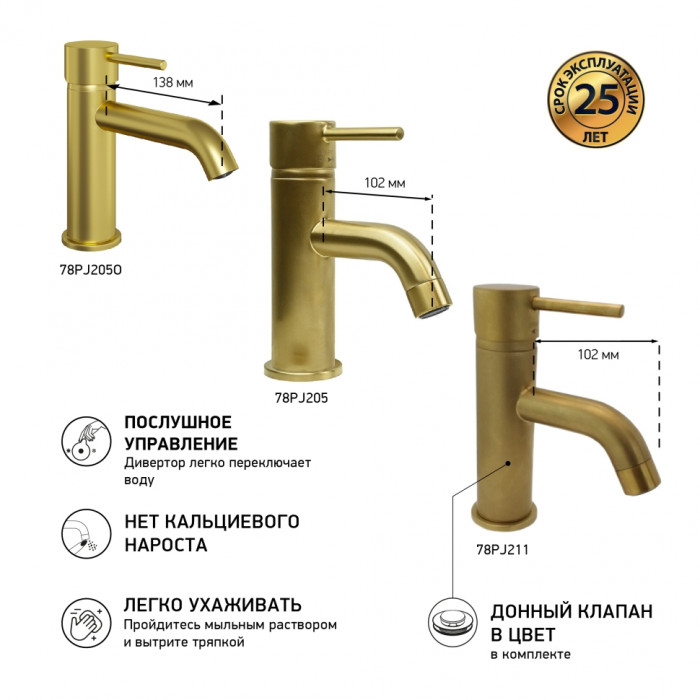 Смеситель для раковины PAINI Cox без донного клапана,, удлиненный излив, брашированное золото PVD (PJ) 78PJ205O смесители для раковины цветные Италия