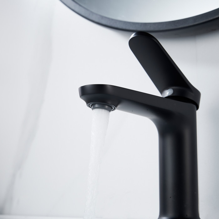 Выглядит стильно, матовый черный не маркий. Ход рычага плавный, напор регулируется точно. Из минусов - тяжёлый, пришлось аккуратно подтягивать крепеж.