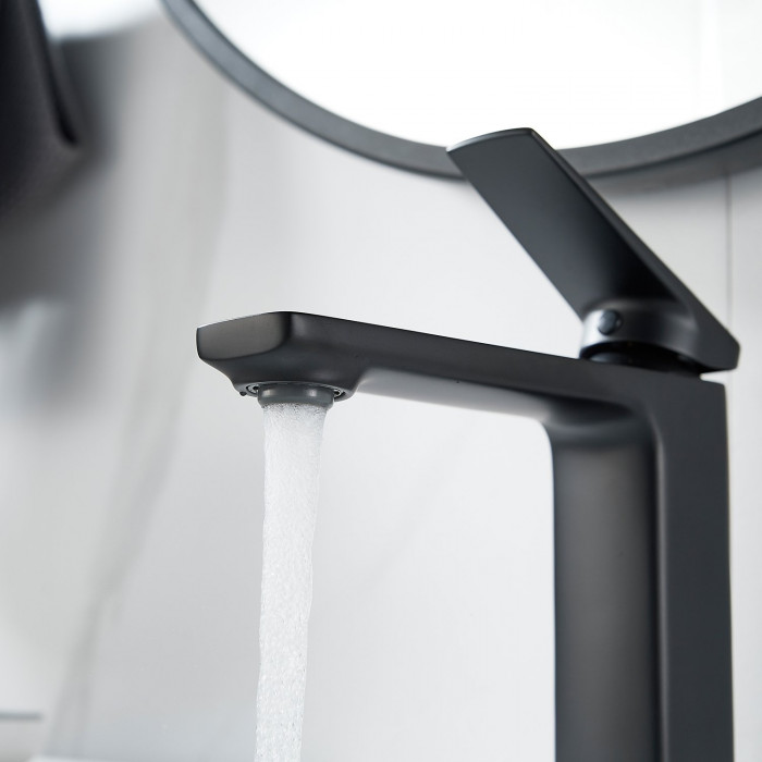 Выглядит стильно, матовый черный не маркий. Ход рычага плавный, напор регулируется точно. Из минусов - тяжёлый, пришлось аккуратно подтягивать крепеж.