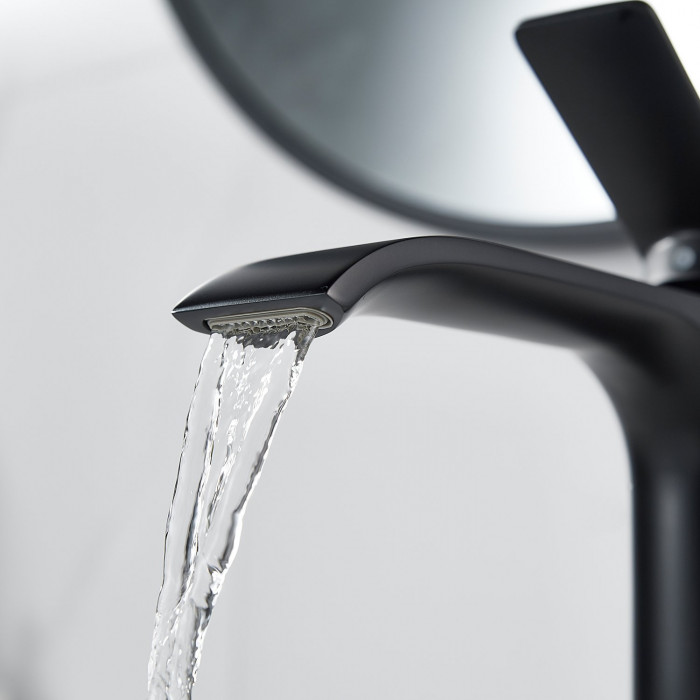 Выглядит стильно, матовый черный не маркий. Ход рычага плавный, напор регулируется точно. Из минусов - тяжёлый, пришлось аккуратно подтягивать крепеж.