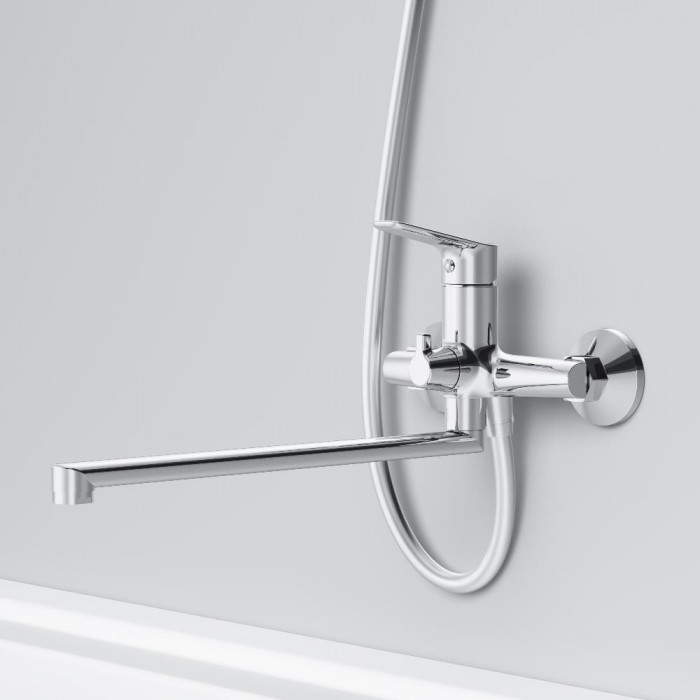 Универсальный длинный излив позволяет использовать смеситель как для ванны так и для рядом стоящей раковины. Поворотный переключатель с излива на ручной душ -максимум комфорта и надежности в использовании.