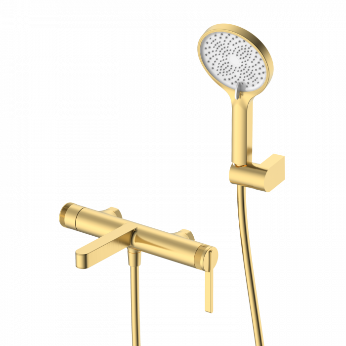 - Душевая трехрежимная лейка и шланг длиной 150 см уже в комплекте. Германия латунь золото матовое современный керамический картридж настенный 5 лет смеситель, эксцентрики-2шт, декоративная шайба (отражатель)-2шт, шланг душевой 1,5м PVC, лейка душевая 3 режима, держатель душевой лейки, паспорт изделия, брендовый пакет