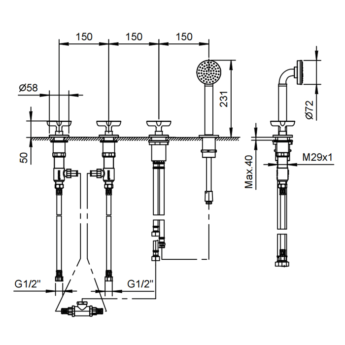Смеситель для ванны Fantini Icona Classic 53 02 R067 Хром Fantini Icona Classic Смеситель на борт ванны, 4 отв., без излива, с ручн.душем, цвет: хром