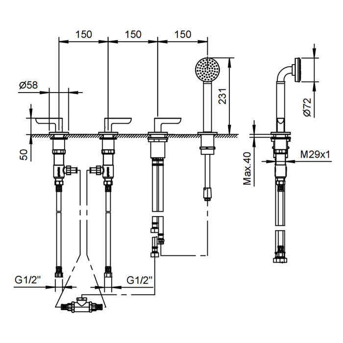 Смеситель для ванны Fantini Icona Deco 53 02 R167 Хром Fantini Icona Deco Смеситель на борт ванны, 4 отв., без излива, с ручн.душем, цвет: хром