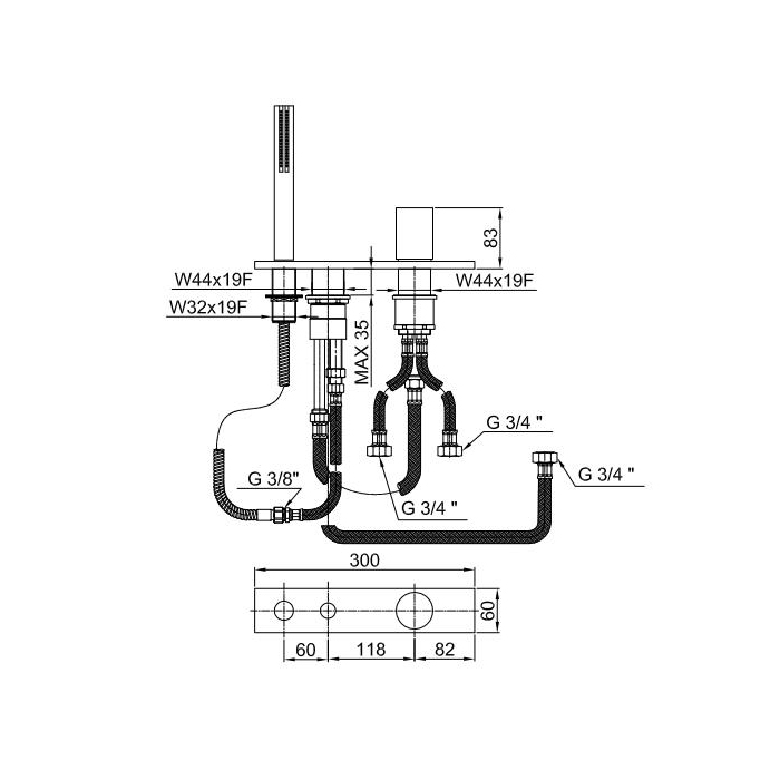 Смеситель для ванны Fantini Milano 31 93 3067 Матовая сталь Fantini Milano Смеситель на борт ванны, на 3 отв, на 2 источника, с ручн.душем, без излива, цвет: матовая натуральная сталь