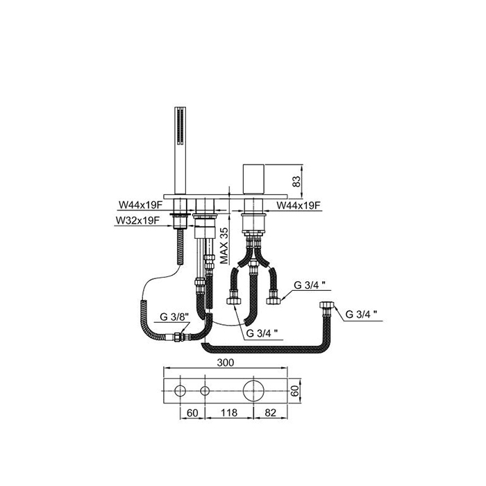 Смеситель для ванны Fantini Milano 31 P5 3067 Gun metal Fantini Milano Смеситель на борт ванны, на 3 отв, на 2 источника, с ручн.душем, без излива, цвет: Matt Gun Metal PVD