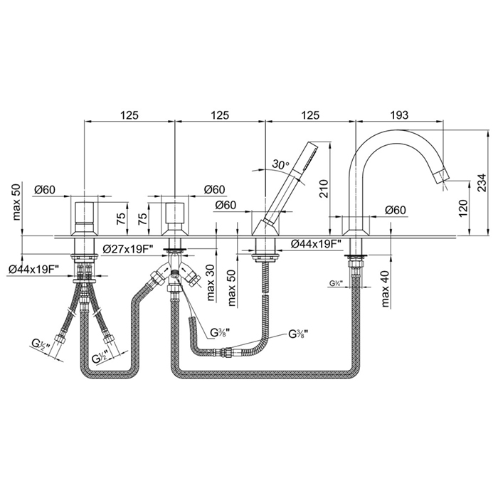 Смеситель для ванны Fantini Nostromo 50 02 1665 Хром Fantini Nostromo Смеситель на борт ванны, 4 отв., с ручн душем, излив 195мм, цвет: хром