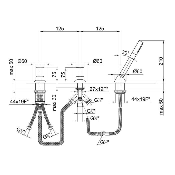 Смеситель для ванны Fantini Nostromo 50 02 1667 Хром Fantini Nostromo Смеситель на борт ванны, на 2 источника, 3 отв., с ручн душем, без излива, цвет: хром