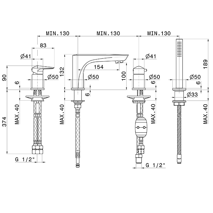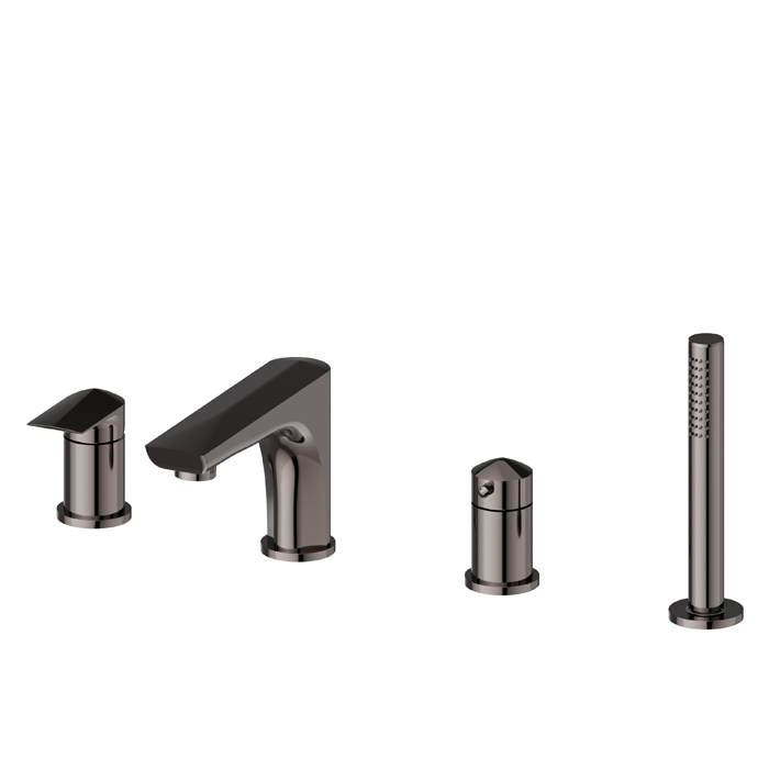 Смеситель для ванны Newform Delta Zero 72282C.58.063 Gun metal Newform Delta Zero Смеситель на борт ванны на 4 отверстия, с изливом, переключателем и ручным душем, цвет: PVD gun metal