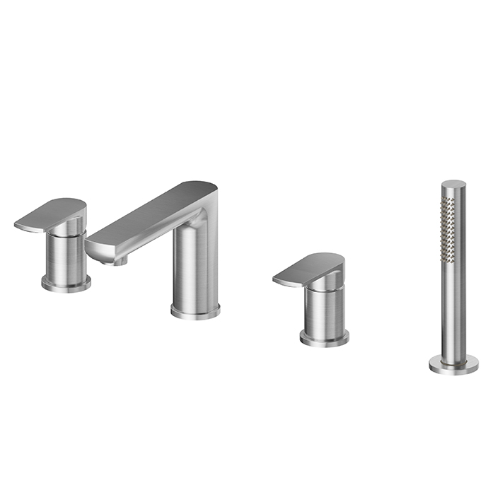 Смеситель для ванны Newform Haka 72082C.59.066 Нержавейка Newform Haka Смеситель на борт ванны на 4 отверстия, с ручным душем, изливом и переключателем, цвет: PVD brushed stainless steel