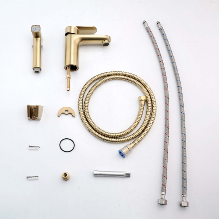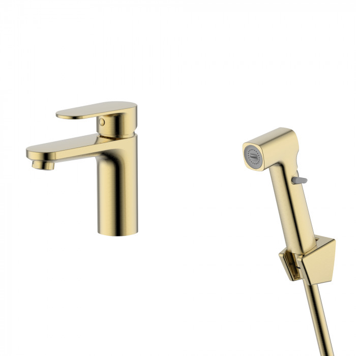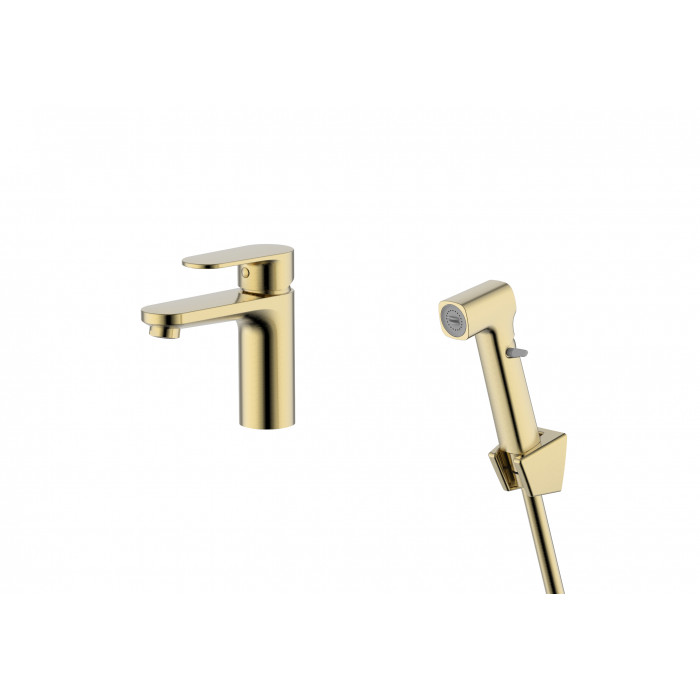 Смеситель для раковины Aquatek НИКА AQ1812BG золото шлифованное AQ1812BG НИКА смеситель для раковины 90 без донного клапана с гигиеническим ручным душем, шлиф.золото 40x9,5x34,5 1. Смеситель